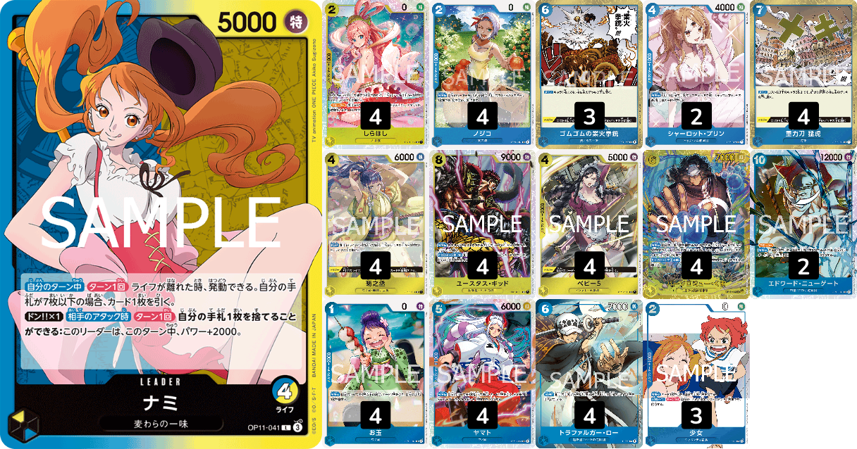 これに新弾の【黄5ナミ④、黄7ロビン④、黄イベ1ナミ④】を追加すればすぐ使える! デッキ保存のために何となく【青6ロー④、黄2しらほし④、青7イベ④】を入れてます!